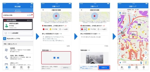 写真投稿は、災害発生時や警戒時など特定の期間および地域に限定して行なえる。投稿する際は「災害状況の投稿」をタップし、写真を撮影またはライブラリから選択。状況に関する項目を選び「投稿する」を押すと、「災害マップ」上に写真が反映される。