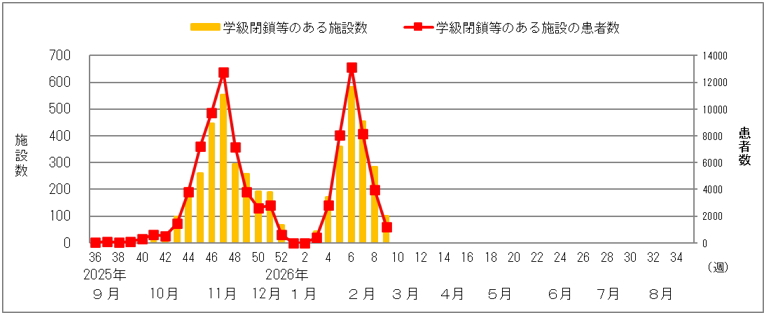 2026年第9週に学級閉鎖等5のあった保育所・学校等は100施設、患者数は1,222名でした。