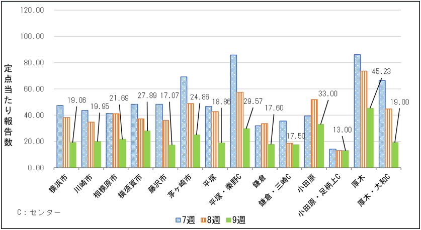 小田原保健福祉事務所足柄上センターを除き、全ての保健福祉事務所・センターで前週に比べて定点当たり報告数が減少しました。