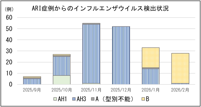 急性呼吸器感染症(ARI)サーベイランス(詳しくはARIサーベイランスが始まりました!をご覧ください)におけるインフルエンザウイルス検出状況は次のとおりです。