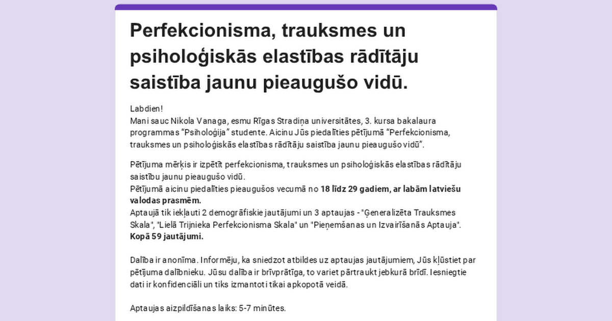 こんにちは!私は学士号の一環として研究を行いました "若者における完璧主義、不安、心理的柔軟性スコアの関係"。 あなたの助けにとても感謝しています:) この調査は匿名で行われ、18~29歳の人を対象としている。 調査には約 4 ~ 6 分かかります。 ありがとうございます:) 🧎♂️🧎♂️ Latvia