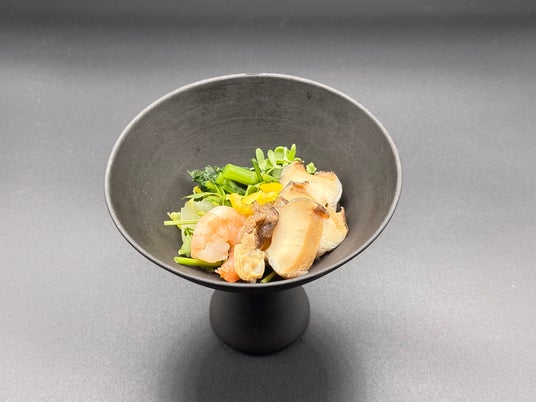 ■メニュー barrierでは、三方(さんぼう)をお膳として利用し、岡持ち(おかもち)に収められた三つのお椀料理に、サイフォンで抽出された一番出汁を注ぎます。 これにより、一杯のお出汁がお客様の食体験に奥深さと芳醇さを加えます。 barrierは、伝統的な日本料理のエッセンスを守りつつも、現代的なアプローチで新たな魅力を引き出すことを目指しています。 漆黒の空間で五感を研ぎ澄ませて、出汁に合う料理をお楽しみください。