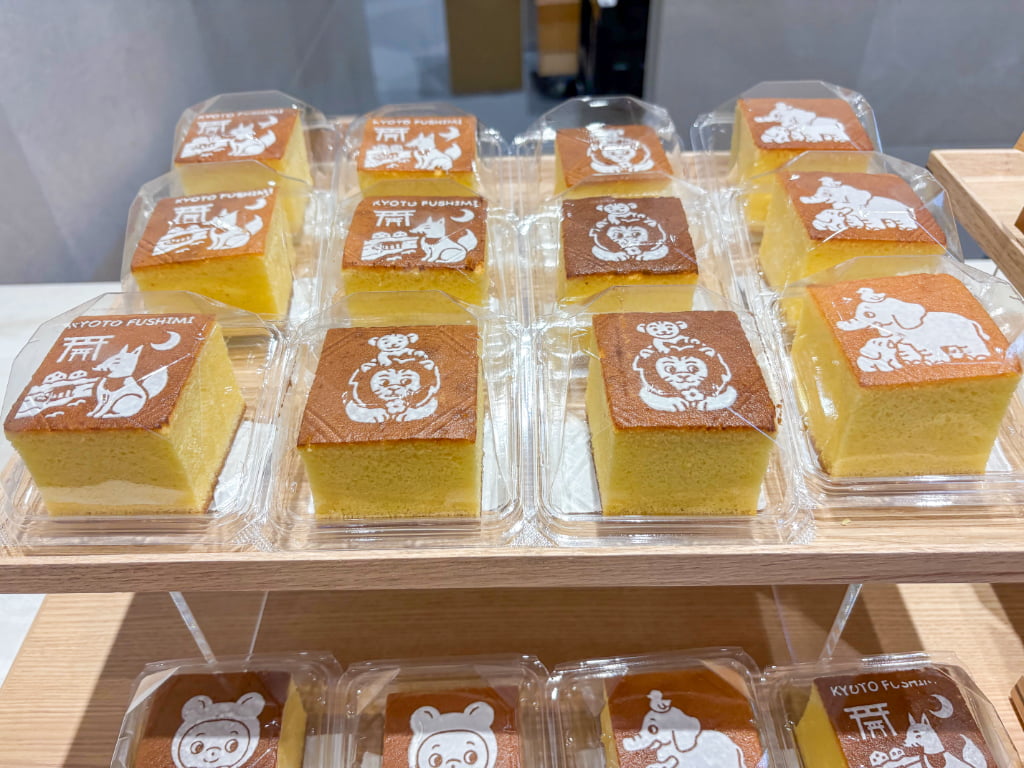 「国産バターのくちどけカステラ」は、カルピス(株)特撰バターを使用し、くちどけなめらかに仕立てられています。4種のかわいいイラストが揃い、地元の伏見稲荷大社をモチーフにしたデザインは京都土産にもぴったりです。