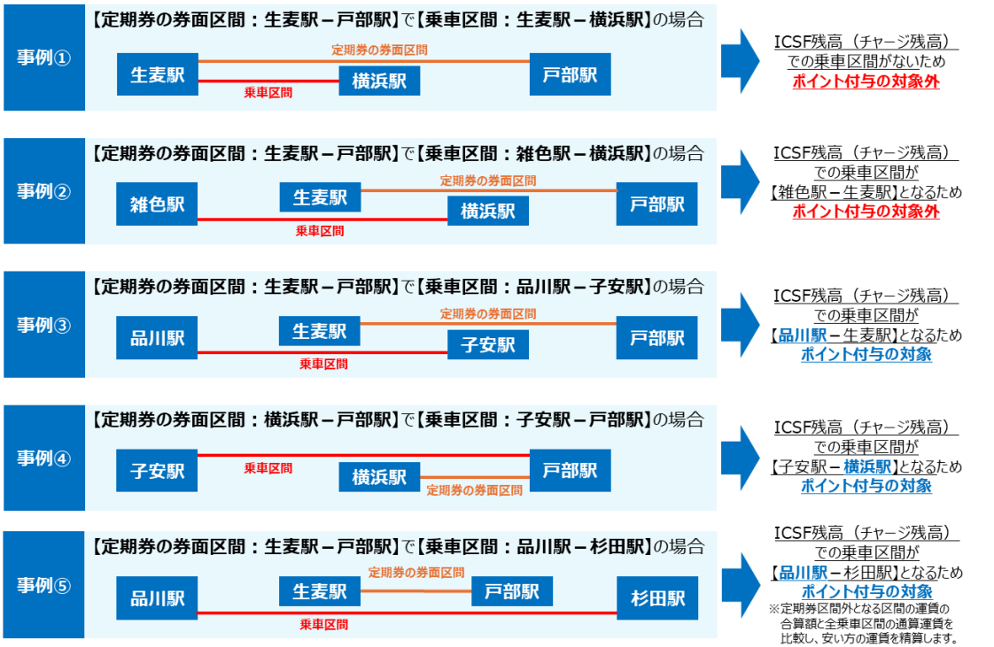 ※チャージ残高(ICSF残高)で精算された区間の乗車駅または降車駅が対象駅である必要があります。また定期券の券面区間を含めて利用される場合はポイント付与の対象外となる場合がございます。(詳細は以下の「4.キャンペーンの注意事項」をご確認ください。)