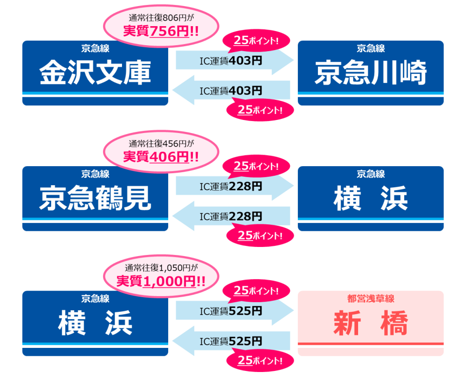 ・実際に乗車した経路とPASMOの運賃精算上の経路が異なる場合があるため,京急線の利用実績がつかず,ポイントが付与されない場合があります。
