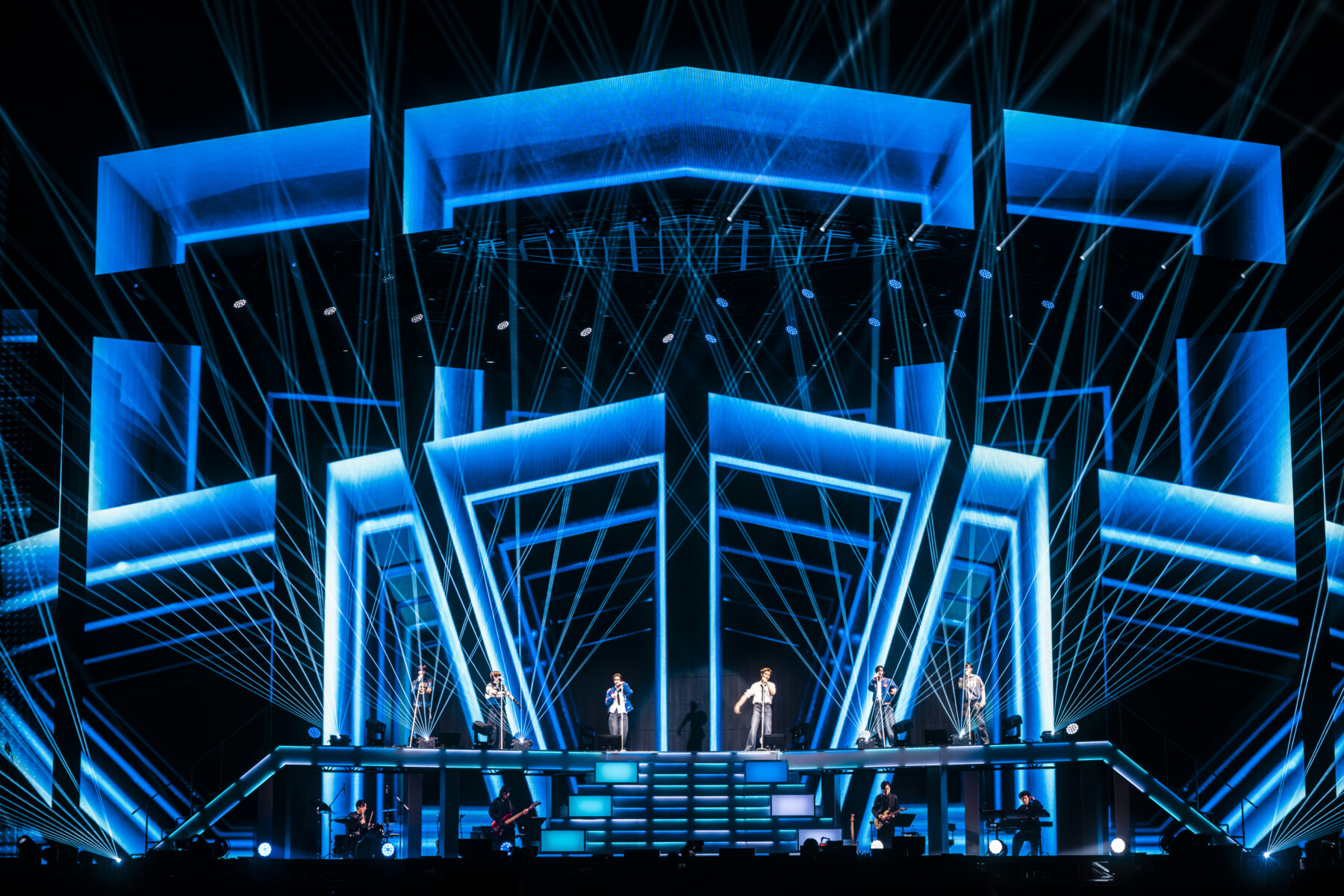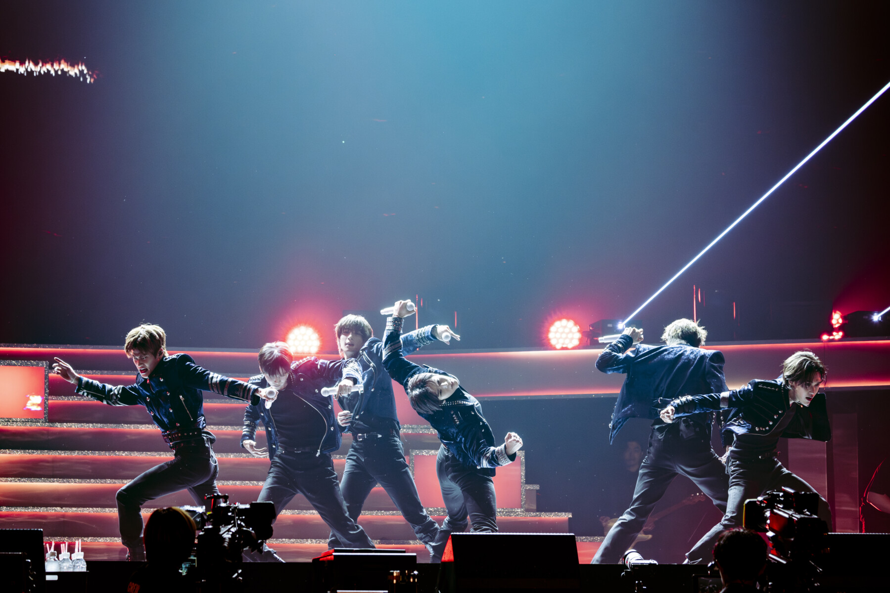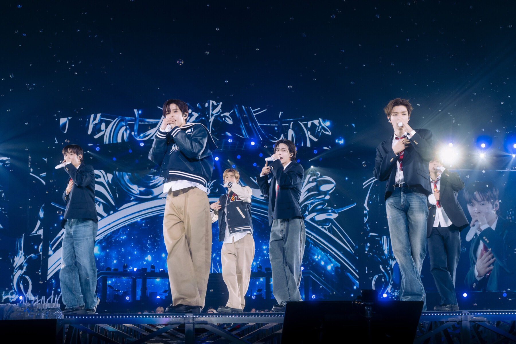 VCRを挟み、再びゴンドラでステージに現れたメンバーの装いは、RIIZEらしいスクールボーイ風のコーディネート。グループのファッショニスタで知られるショウタロウは、セーラーカラーが特徴的なKENZO(ケンゾー)のスタジアムジャケットをベージュのチノ・パンツとあわせ、ソヒは、HUMAN MADE(ヒューマンメイド)のバーシティジャケットを着用。ソンチャン、ウンソク、ウォンビン、アントンは、紺色のブレザーと白シャツに、デニムパンツ、お揃いの赤いネクタイが映えるコーディネート。爽やかな6人のスタイルで、青春の1ページを感じさせる。高く、高く上へと上がるリフターに一人ずつ乗って歌唱した楽曲「Combo」では、青く染まる会場を一面を目にしたメンバーの目には涙が潤んでいるようにも見えた。