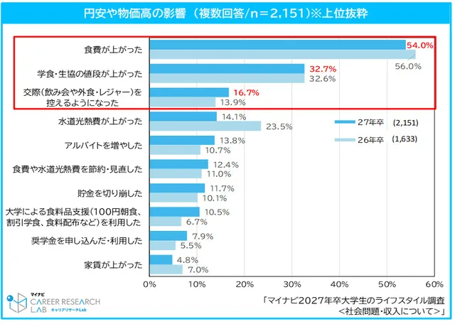 円安や物価高が学生生活に及ぼす影響については、過半数の層が食費の増加を実感している。学内の生協や食堂における値上げも大きな負担となっており、出費を抑えるために友人との外食やレジャーを控える傾向が強まった。