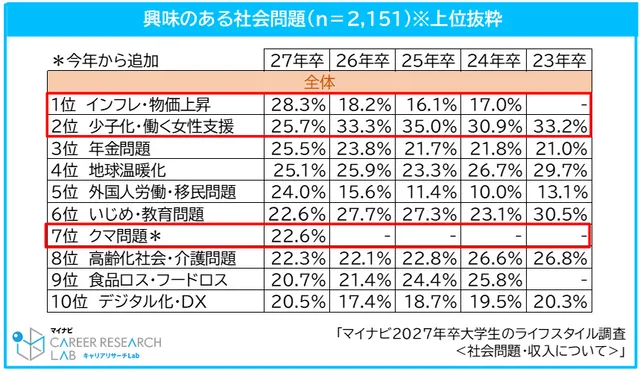 また、今年から新たに選択肢に加わったクマによる被害問題が上位に食い込むなど、身近な環境の変化にも敏感に反応する姿は、現代の社会不安を物語る実態と言えそうだ。