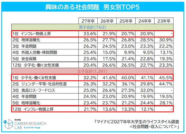 一方、女子学生の関心は少子化や働く女性への支援に最も集まるなど、性別による意識の差異も顕著に。