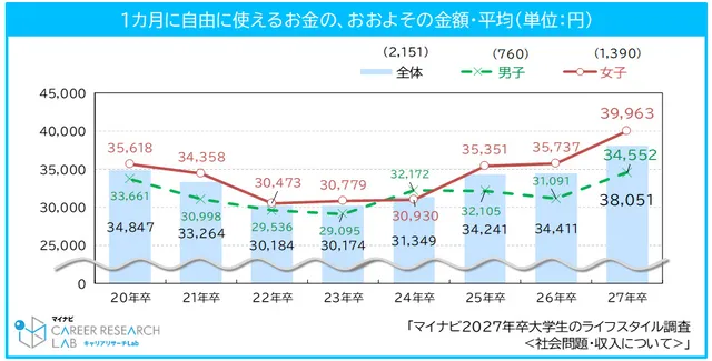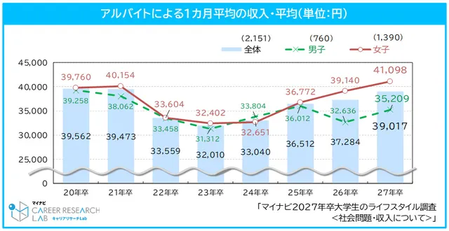 1カ月あたりのアルバイト収入は平均で約3万9000円に達し、コロナ禍以前の水準を回復した。特に女子学生の収入額は調査開始以来の最高値を記録しており、労働市場における学生の貢献度が高まっている様子が伝わってくる。