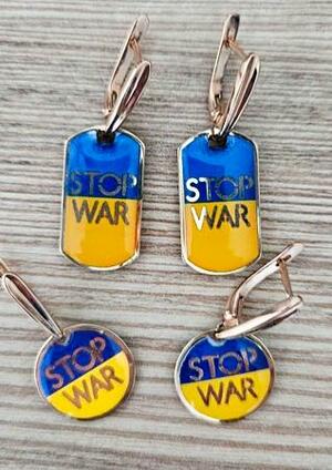 バイアスロンで金メダルを獲得したウクライナのオレクサンドラ・コノノワが表彰式に臨む際に、国際パラリンピック委員会から外すよう求められた「戦争を止めろ」と書かれたイヤリング(同国パラ委員会提供、共同)