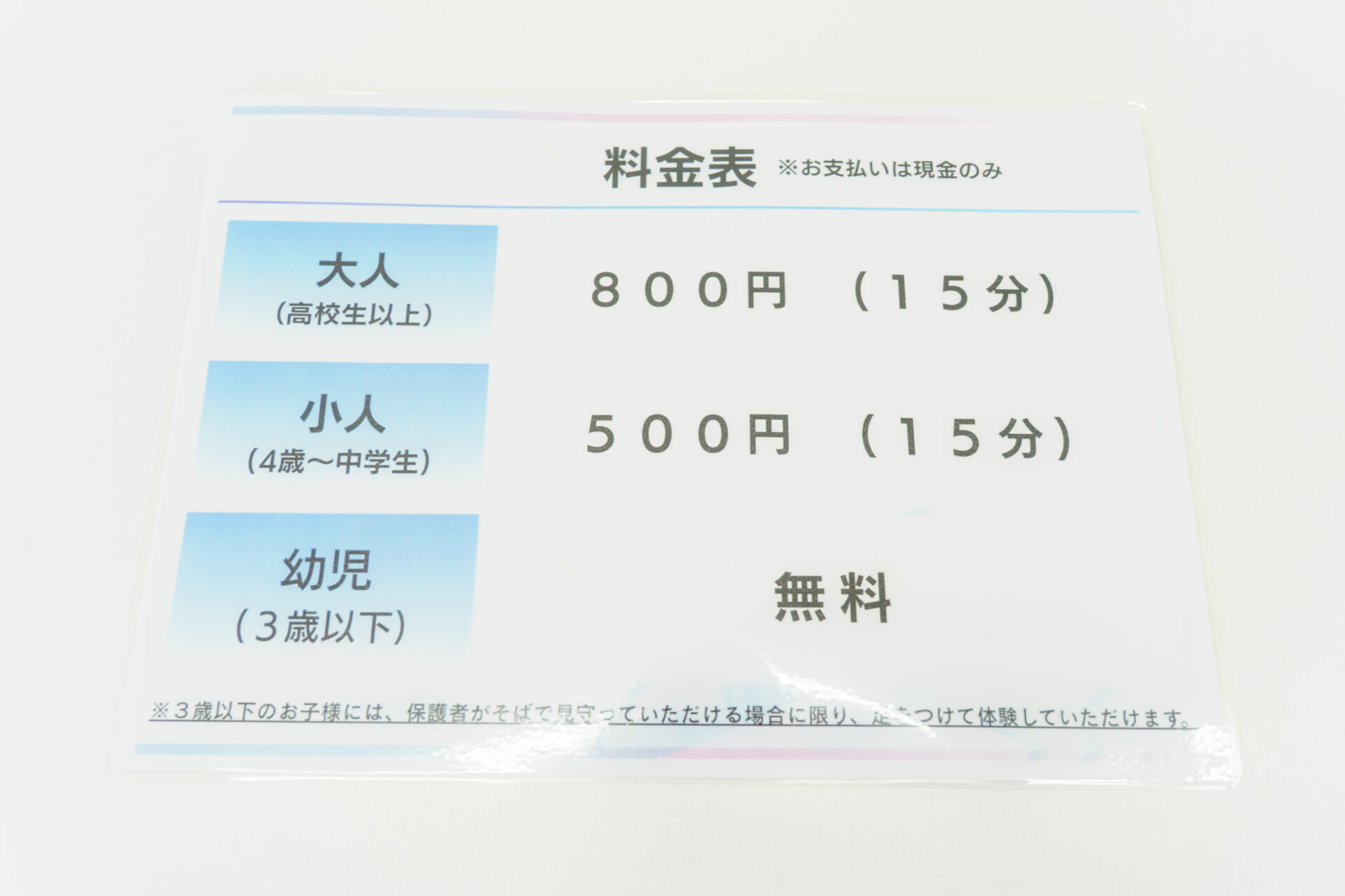 まずは受付で注意事項の説明とお支払いを済ませます。