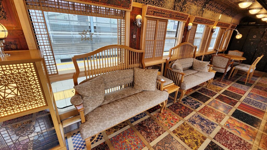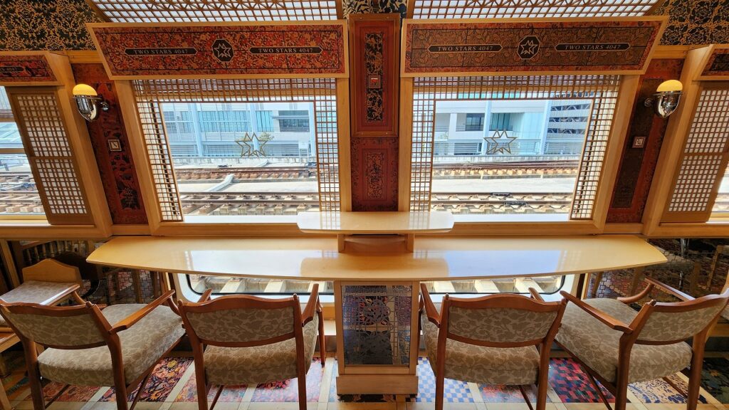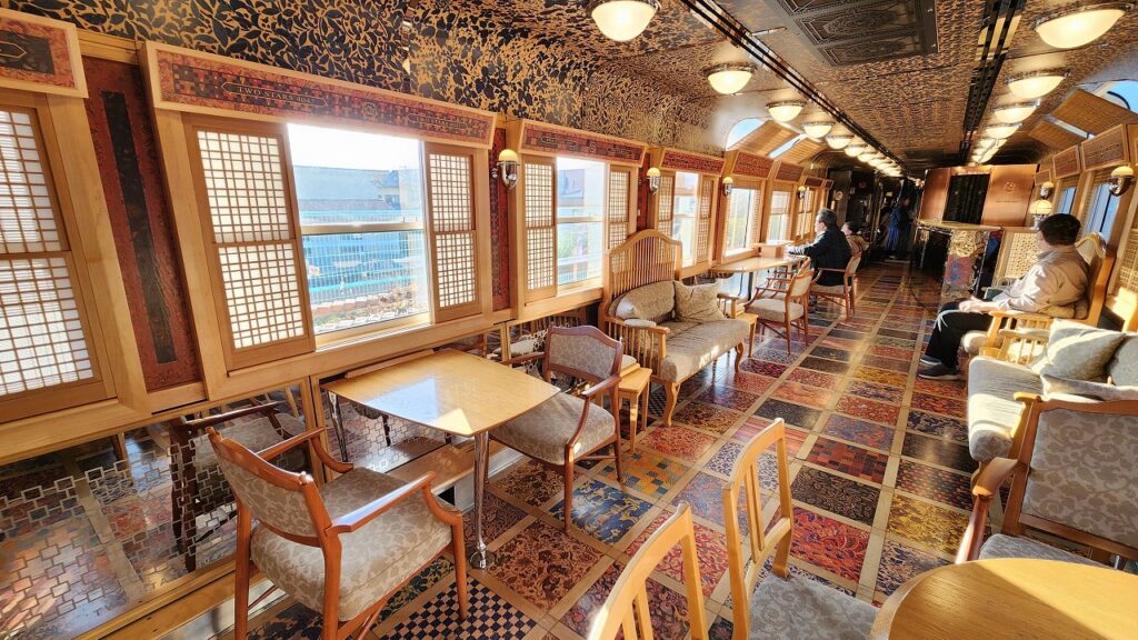 車内を散策してみると、窓側に向いた席などもあり、車窓の景色をゆったり眺められる工夫がされています。