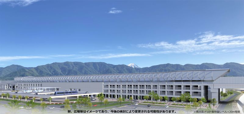 (仮称)山梨県駅は、延長約1200メートル、最大高さ約32メートルの高架橋等構造物となる。ホーム区間の最大幅員は約46メートル。工事内容は、ラーメン高架橋5連、橋りょう6橋、上屋構造物など。2階部分で南北の駅前広場と接続する。建設地は、甲府市と中央市にまたがる。