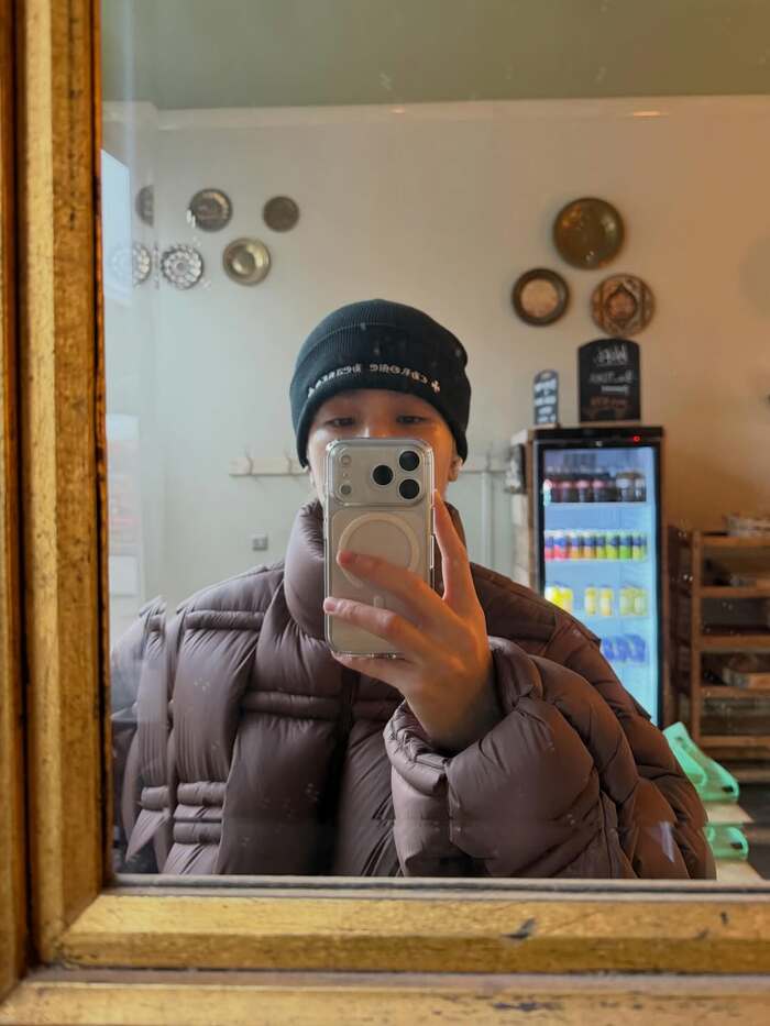 そして、鏡越しに自撮りをしたショットも公開!鏡に映った室内を見てみると、壁に丸い形の装飾が飾られていたり、中身の見えるコンパクトな冷蔵庫が置かれていたりと、どこかレトロな雰囲気が漂っています。