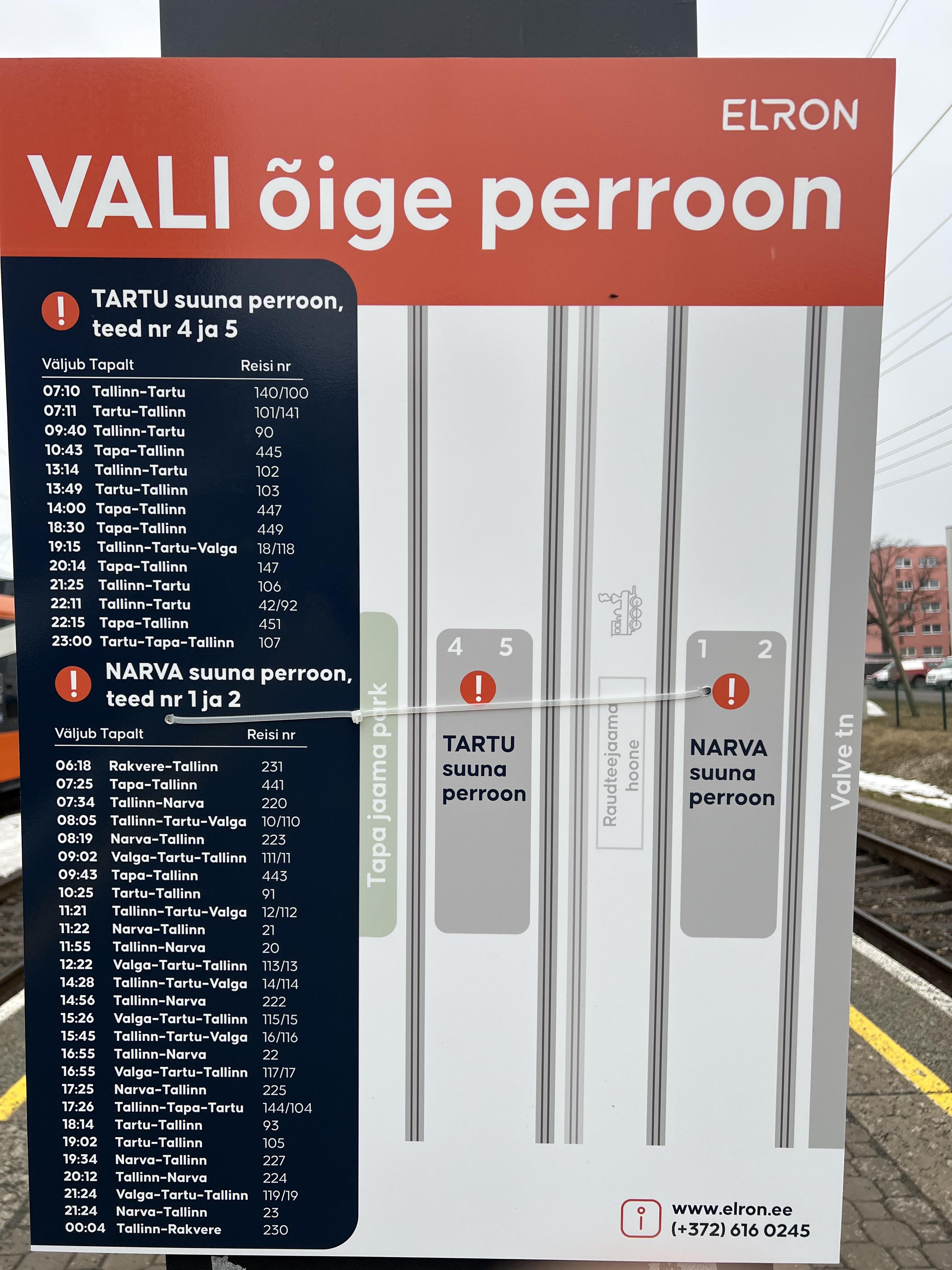 注: Reddit では写真を投稿するときにテキストを変更できないため、前の投稿を削除する必要がありました。 タパで鉄道工事が行われる前は、タルトゥの列車は 4 番線と 5 番線、ナルバ線の列車は 1 番線と 2 番線で走っていて、どのプラットホームに行けばよいのかは非常に簡単でした。しかし、今ではタルトゥの列車の半分が 1 番線と 2 番線で走っているため、タルトゥかナルバの列車かどうかを確認するだけではもうできず、この旗を探してどのプラットホームに行けばよいのかを確認する必要があります。 Estonia
