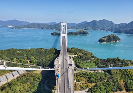 流のひとつ「来島海峡」の急流を間近に感じながら瀬戸内の多島美の絶景や来島海峡大橋を真下か