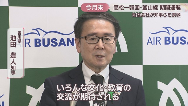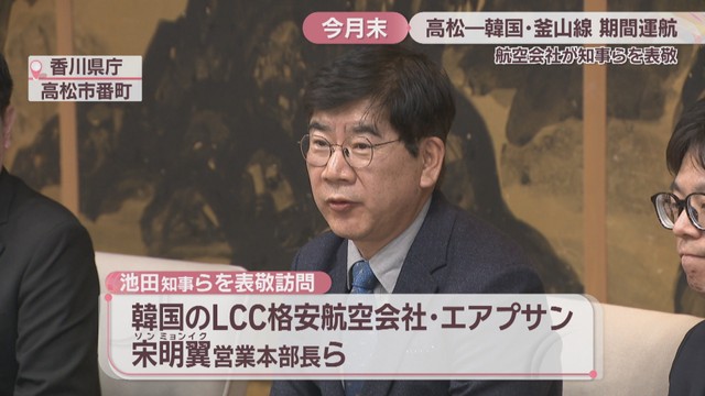 香川県の池田知事らを表敬訪問したのは、韓国のLCC(格安航空会社)エアプサンのソン・ミョンイク営業本部長ら3人です。高松と韓国・釜山の期間運航を記念して行われたものです。