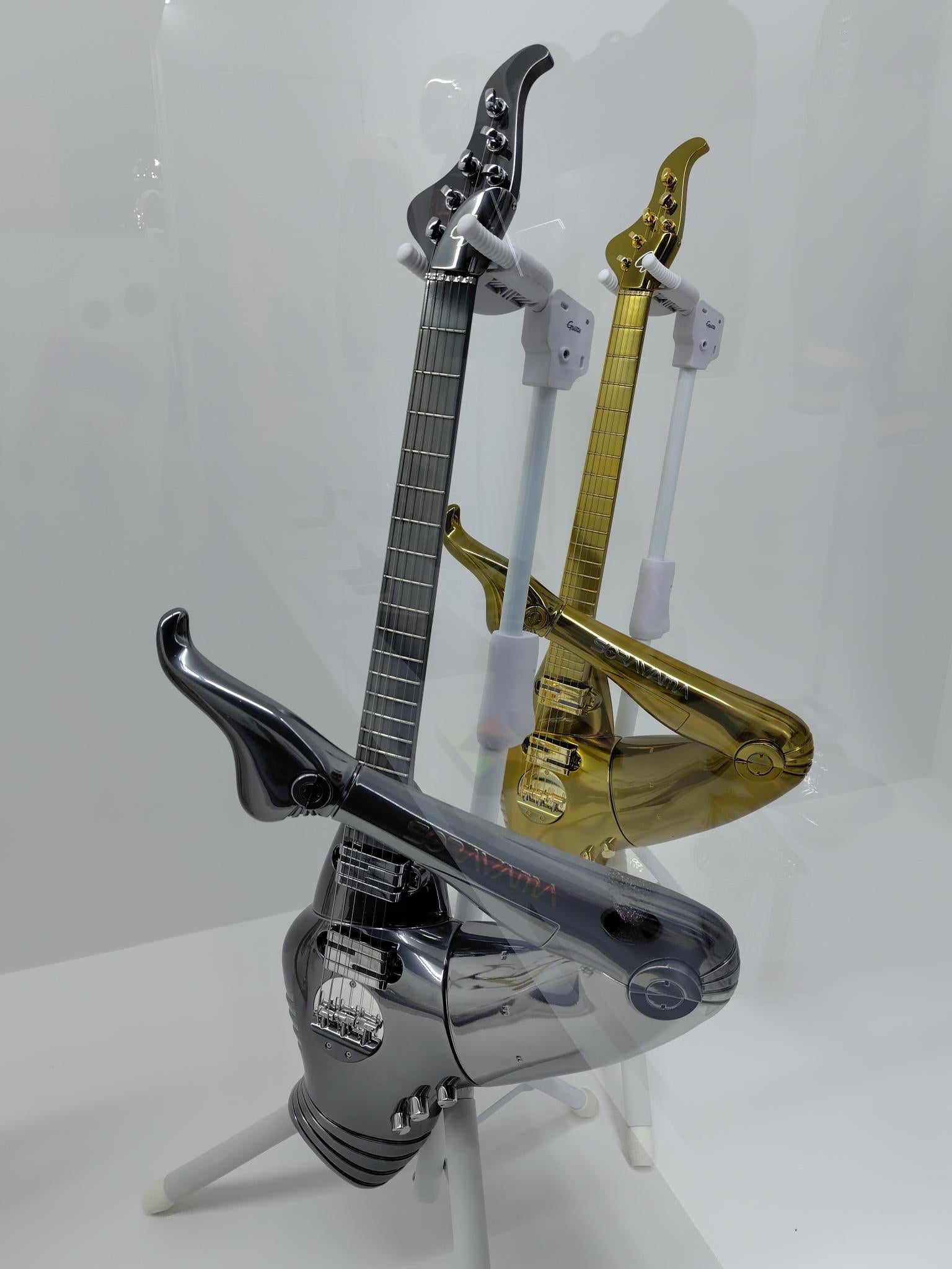 このエレキギターにはしびれました。脚を伸ばせば、ステージ上の支えになるのでしょうか。