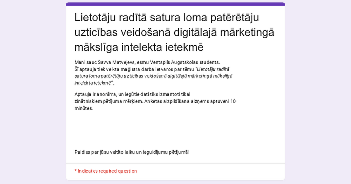 私はデジタル環境におけるユーザー生成コンテンツ (UGC)、人工知能、ブランドへの信頼に関する修士論文を書いています。 3 ~ 4 分程度で匿名の短いアンケートにご回答いただければ幸いです。あなたの答えは学術研究に役立ちます。ご協力いただきありがとうございます! https://docs.google.com/forms/d/e/1FAIpQLSf6a7UL7lXgvDBXMM3MuSxmIEP765SkL4f–0qkkApoHwI6rg/viewform?usp=sharing&ouid=116523279598386464923 Latvia