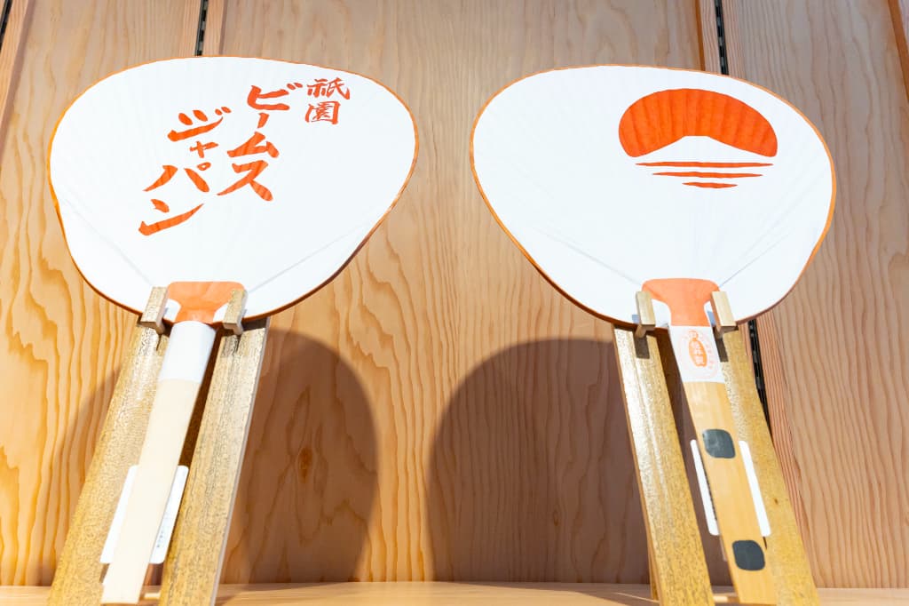 こちらは寛永元年(1624年)創業とされるうちわづくりの老舗「小丸屋住井」の京丸うちわに「ビームス ジャパン 祇園」の名入れをした一品で、白地の扇面に朱の文字が映えます。