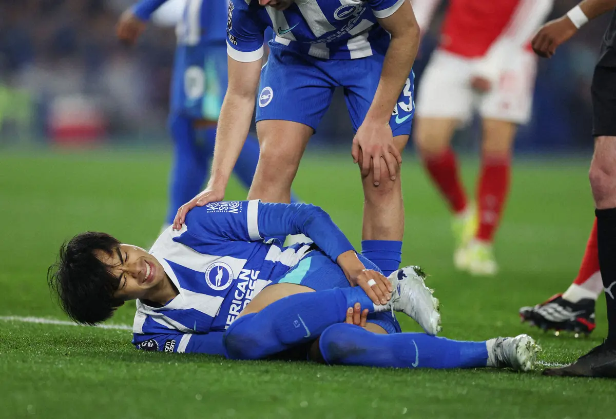 <ブライトン×アーセナル>負傷した左足首を押さえるブライトンの三笘薫(ロイター)