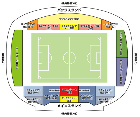 「アウェイゴール裏自由」、メインスタンド指定[M1]、メインスタンド自由[M1]のみです。