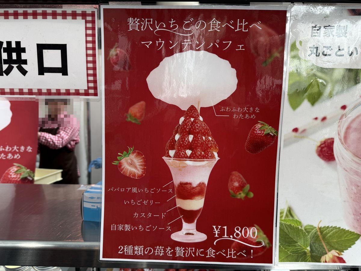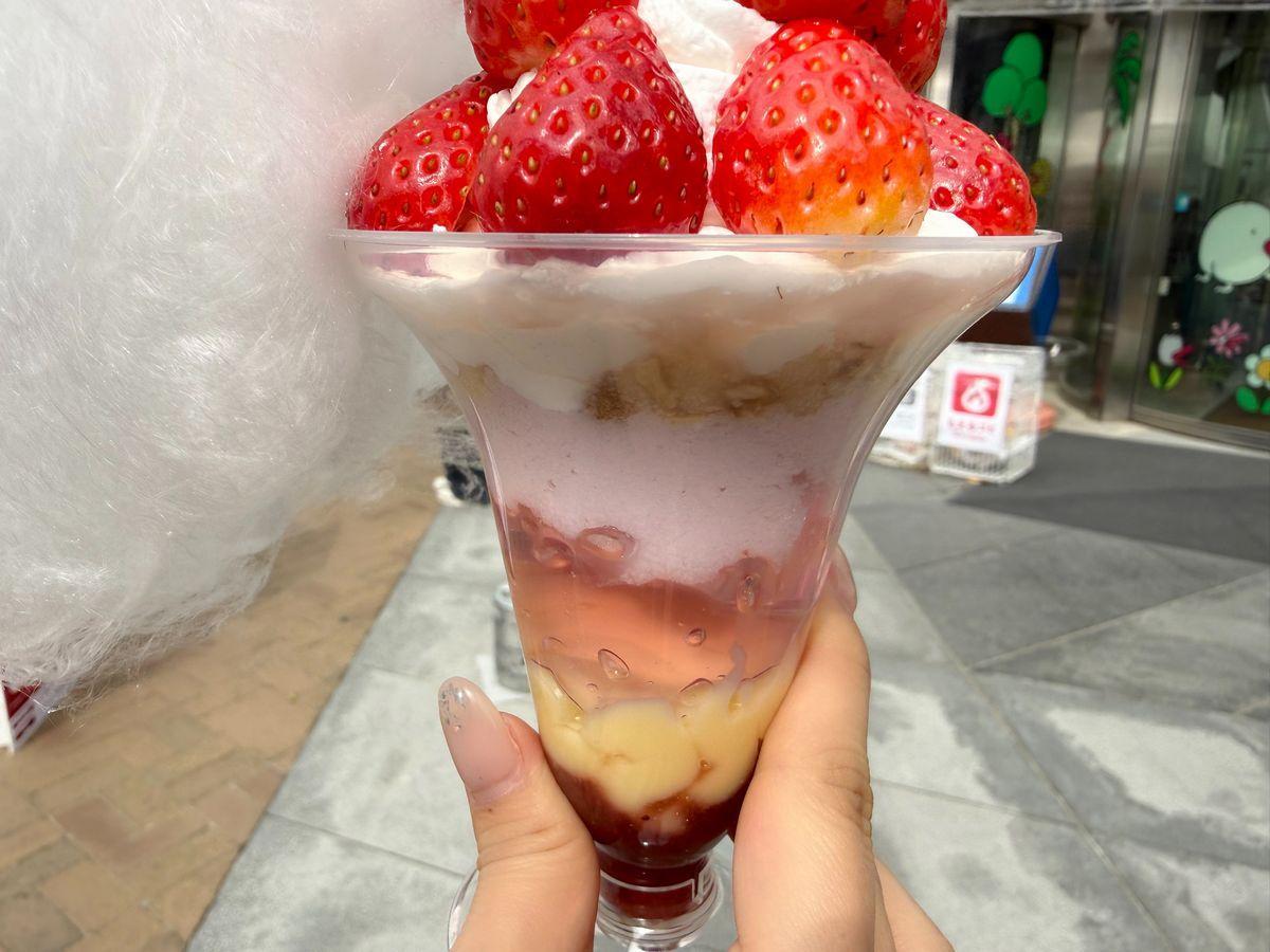こちらが「贅沢いちごの食べ比べマウンテンパフェ」で、大きなわたあめがトッピングされていて、インパクト大のいちごパフェになっています!