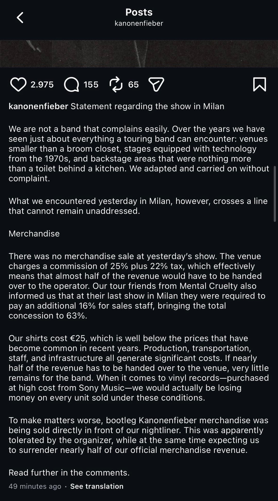 この声明自体は苦情を意図したものではありません。これは、なぜ昨日のコンサートを大幅に縮小しなければならなかったのかを説明するため、そしてお金を払って観に来てくれたすべての人に謝罪するためのものだ。昨夜私たちがステージで提示できたものは、カノネンフィーバーのショーのあるべき姿には程遠いものでした。