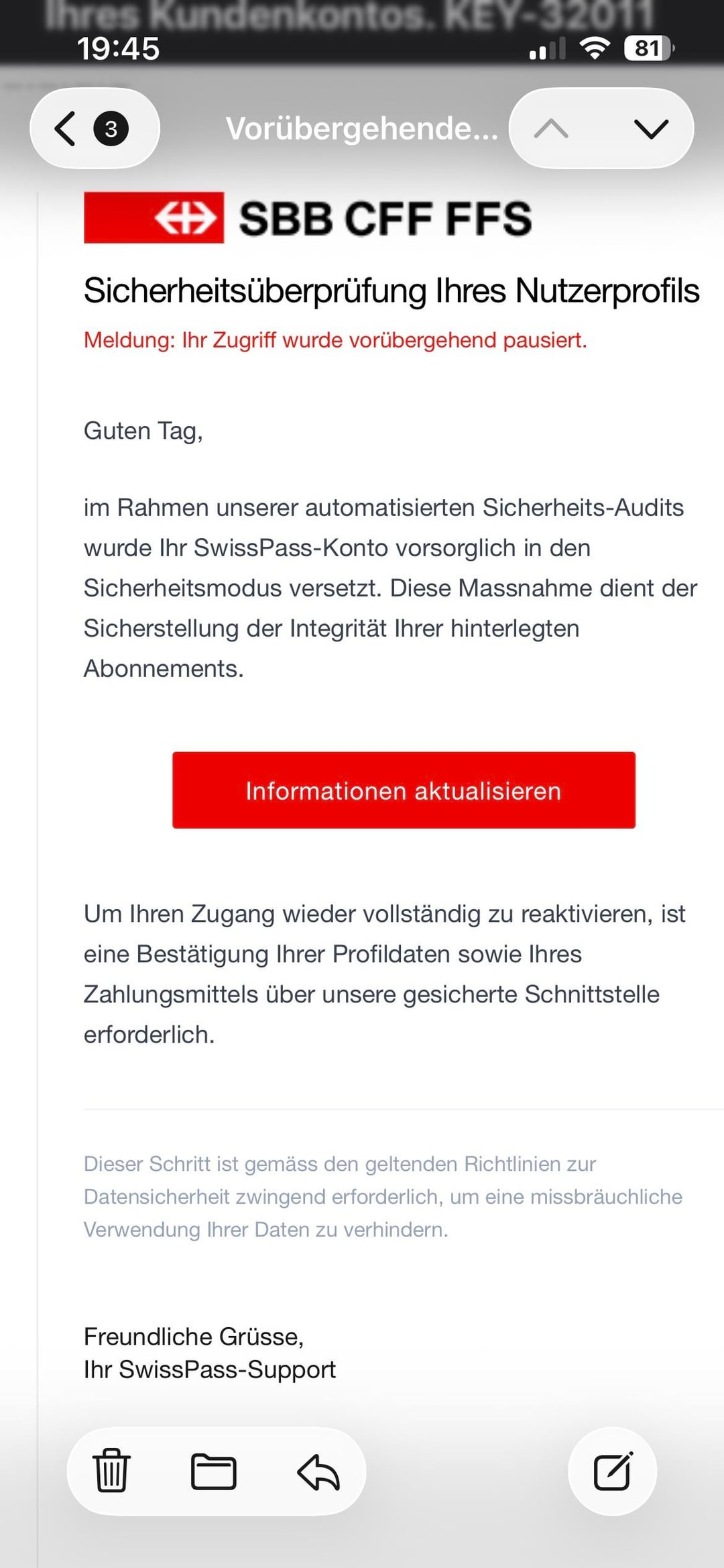 注意してください、私はちょうどこの悪くないメールを受け取ったところです "スイスパス" 受け取る。 送信者のメールアドレスを必ずご確認ください。 SBB の公式メール アドレスは次のとおりです。 https://company.sbb.ch/de/unternehmen/veranttwortung/sicherheit/informationssicherheit/malware-phishing.html Switzerland