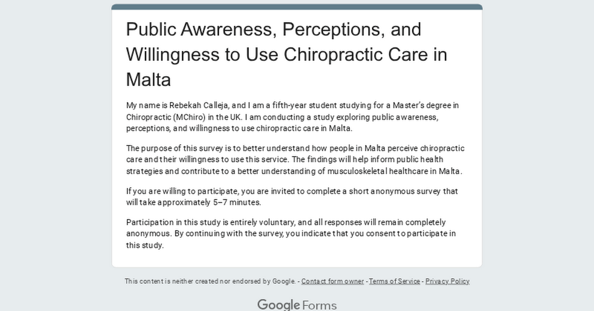私は現在、カイロプラクティックの修士課程の研究を行っており、マルタの人々がカイロプラクティックケアと筋骨格系の健康をどのように認識しているかを理解するために、匿名の短いアンケート(約5〜7分)の回答を集めています。