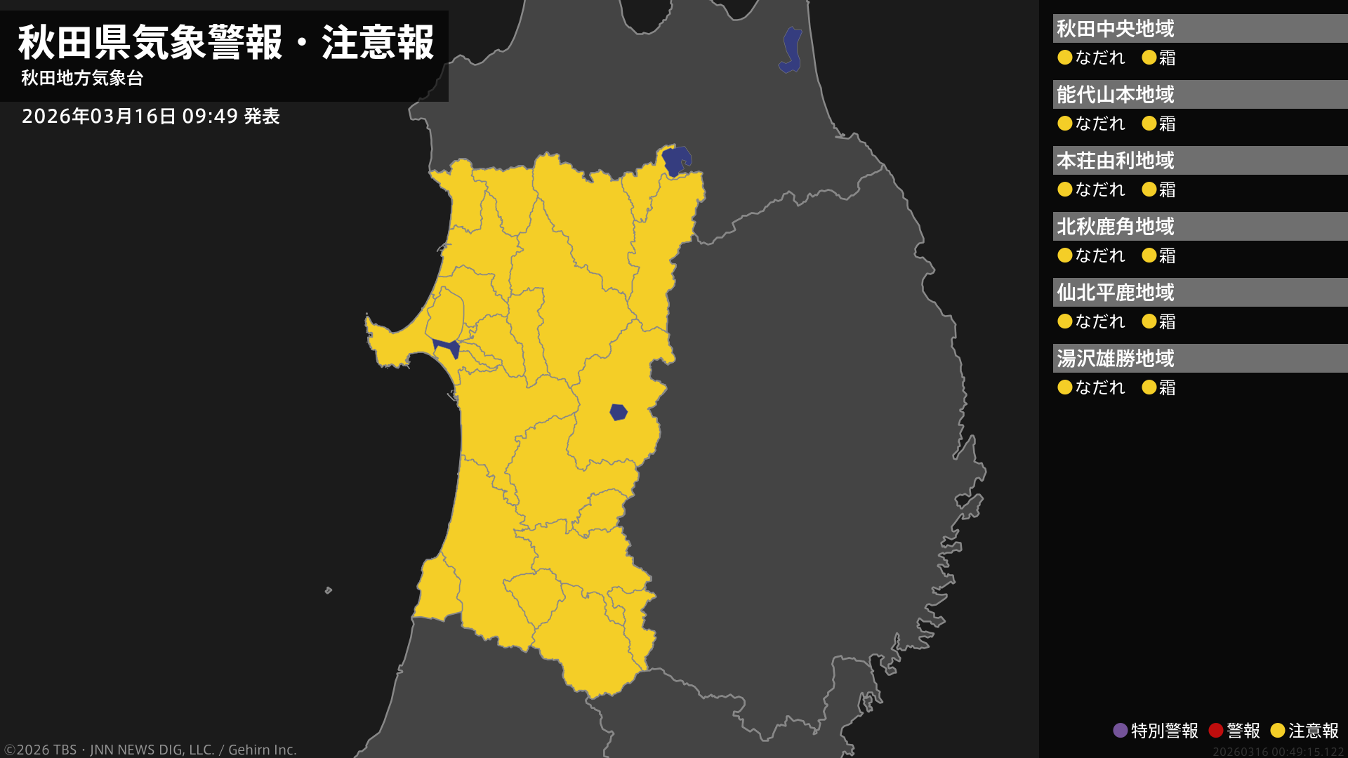 【なだれ注意報】秋田県・秋田市、能代市、横手市、大館市、湯沢市、鹿角市などに発表(雪崩注意報) 16日09:49時点