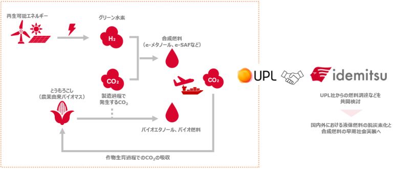 出光はSAF、合成燃料といった次世代燃料や、バイオ燃料の導入・普及とサプライチェーンの構築を進めている。UPLがインドで製造を検討している合成燃料(eメタノール、e-SAF)、バイオ燃料(バイオエタノール、HEFA-SAFなど)を調達することを視野に入れている。