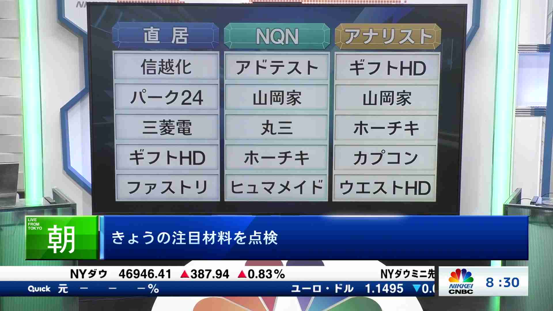 きょうの注目15銘柄 信越化、アドテスト、ギフトHDなど
