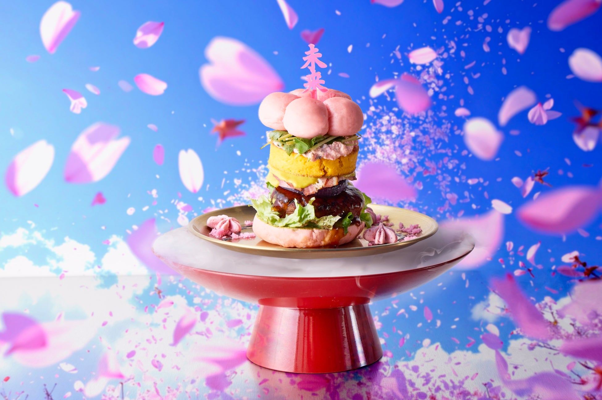 紅梅色の梅の花バンズでお馴染みの「豪華絢爛バーガー 梅未来」が「桜未来」となって登場!ほんのり桜色に色づいたバンズで、厚焼き玉子に照り焼きハンバーグ、トマトやレタスなどボリューム満点の具材を挟みました。甘辛の照り焼き味に、柴漬けタルタルソースや抹茶サワークリームが繊細で複雑な味のアクセントを加える「FUTURE TRAIN」オリジナルバーガーです。
