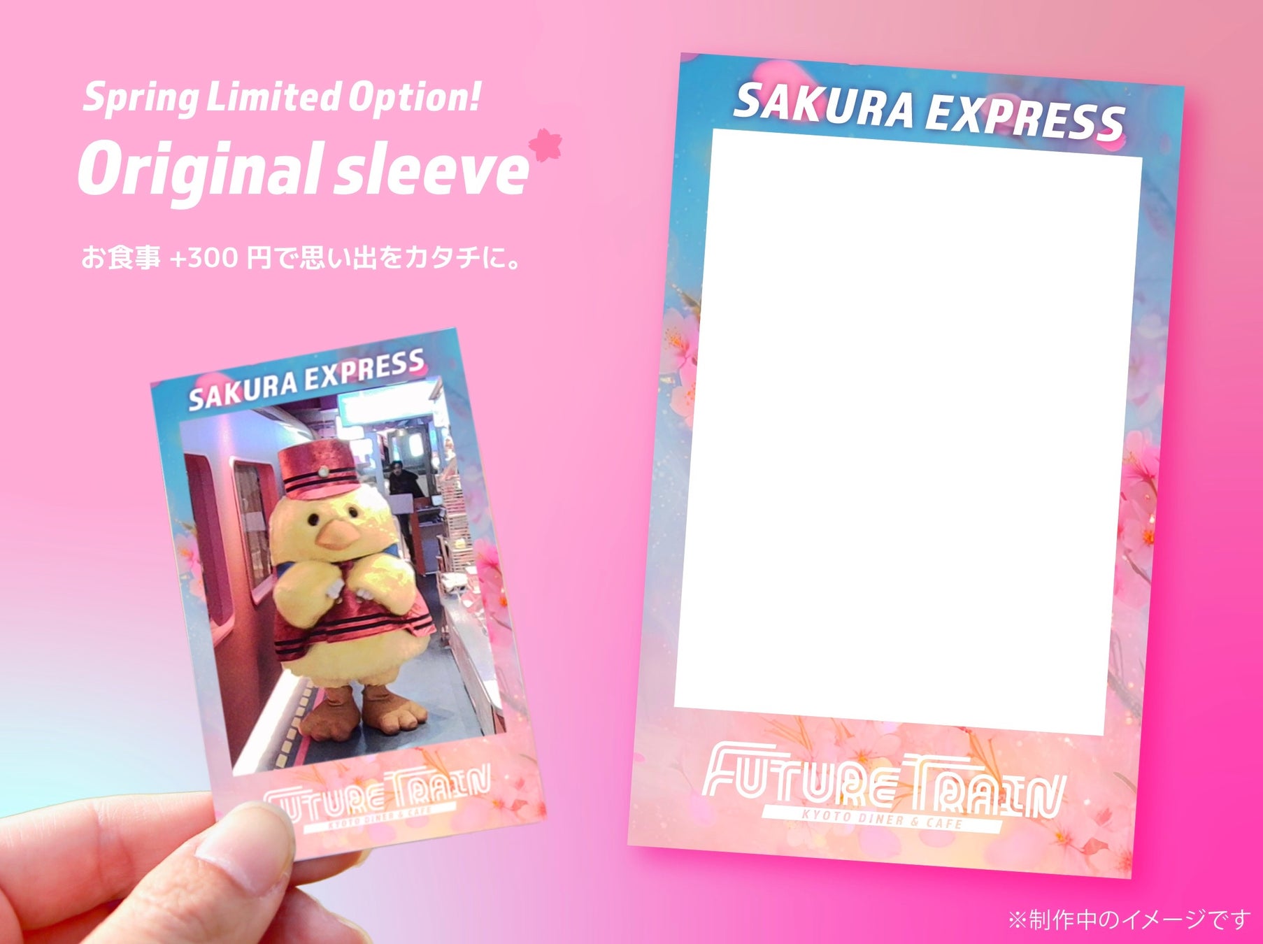 「SAKURA EXPRESS」開催期間中、オリジナルデザインスリーブ付きの撮影をお楽しみいただけるオプションをご用意いたしました(お食事+300円)。