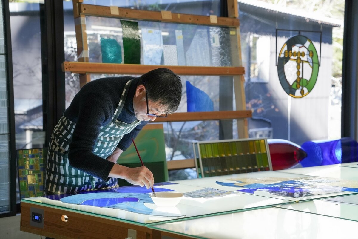 ステンドグラスは静岡県熱海市のクレアーレ熱海ゆがわら工房で制作されました。ドイツ製アンティークグラスを使用し、81色、2,759枚のピースで構成されています。