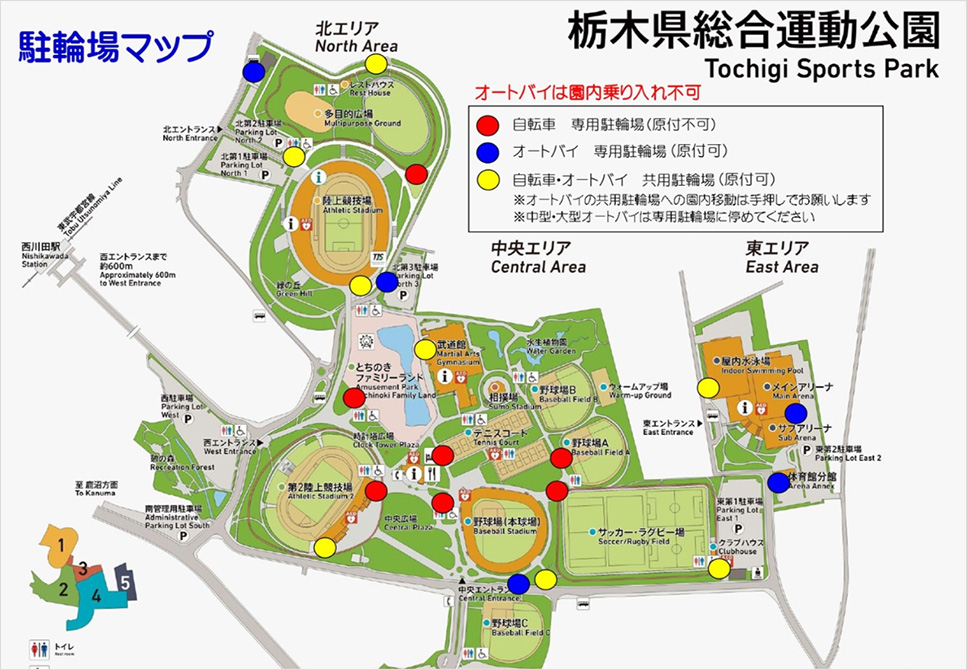 近隣商業施設への駐車はご迷惑となりますので、運動公園専用駐車場をご利用ください。