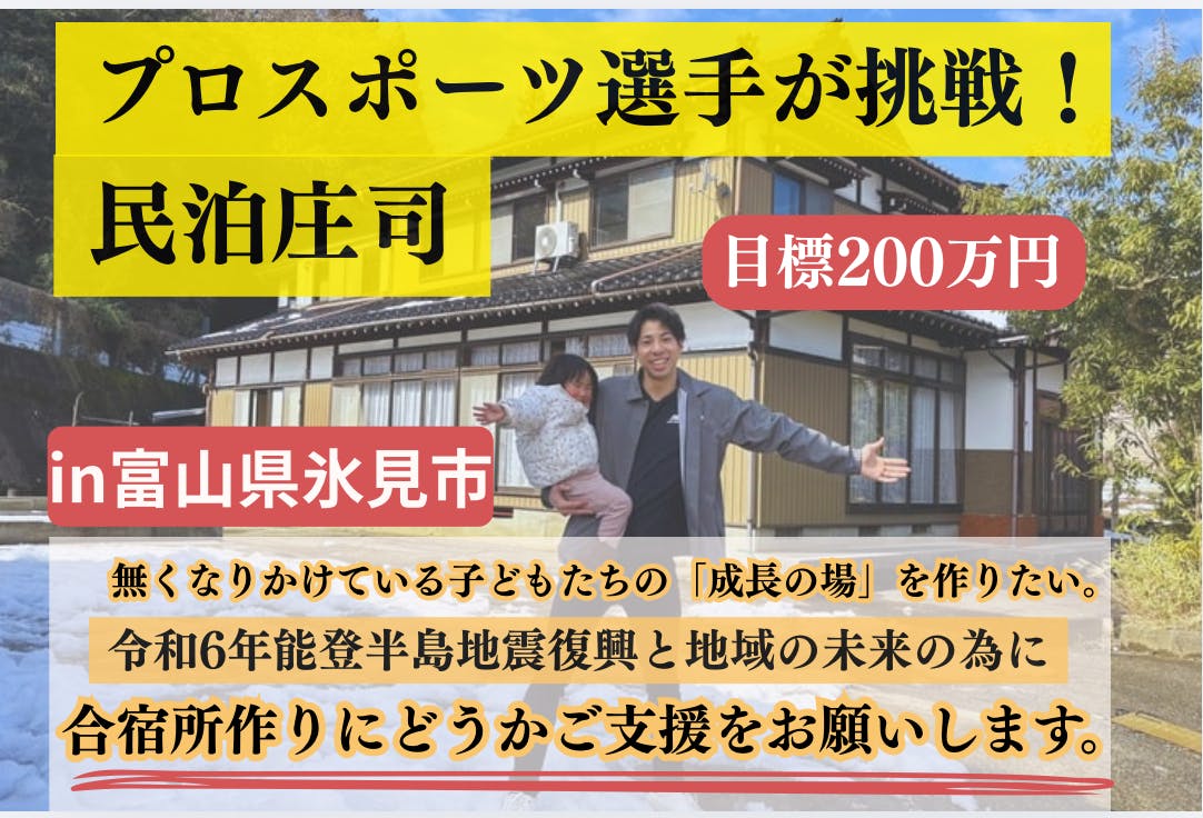このプロジェクトは、ただ宿をつくるためのものではありません。子どもたちが本気で挑戦し、仲間と笑い、時には悔しさを分かち合いながら成長できる場所をつくる挑戦です。スポーツを通して学んできた「人とのつながり」「努力することの尊さ」「仲間と過ごす時間の価値」を、次の世代へつないでいきたいと考えています。古民家を再生し、子どもたちの声が響く合宿所へ。氷見の自然の中で汗を流し、食べ、語り合い、またここに帰ってきたいと思える場所をつくりたい。その想いでこのプロジェクトを立ち上げました。この場所で過ごした時間が、子どもたちの人生のどこかで「頑張る力」や「仲間を信じる力」につながってくれたら、これ以上うれしいことはありません。そしていつか大人になった彼らが、今度は次の世代を連れてこの場所に帰ってきてくれる。そんな温かい循環が生まれる場所を、氷見につくりたいと本気で思っています。この挑戦は、私一人では実現できません。皆さまの応援があってこそ形になります。どうかこの想いに共感していただけましたら、応援していただけると嬉しいです。そしていつか、この場所で皆さまとお会いできる日を楽しみにしています。