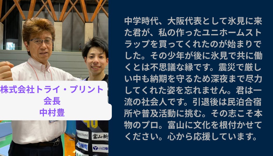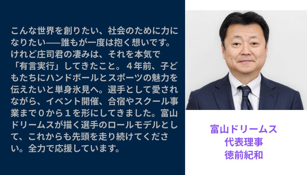 小学5年生から20年ハンドボールを続けており、2019年から福岡県のチームで4年間プレー、2023年には富山県氷見市を拠点とした男子プロハンドボールチーム「富山ドリームス」に移籍。地元氷見の印刷企業で働きながらスポーツ選手として活動し、先日は、日本リーグ通算得点400点を達成するなど、ハンドボールに邁進してきた日々を過ごしてきました。