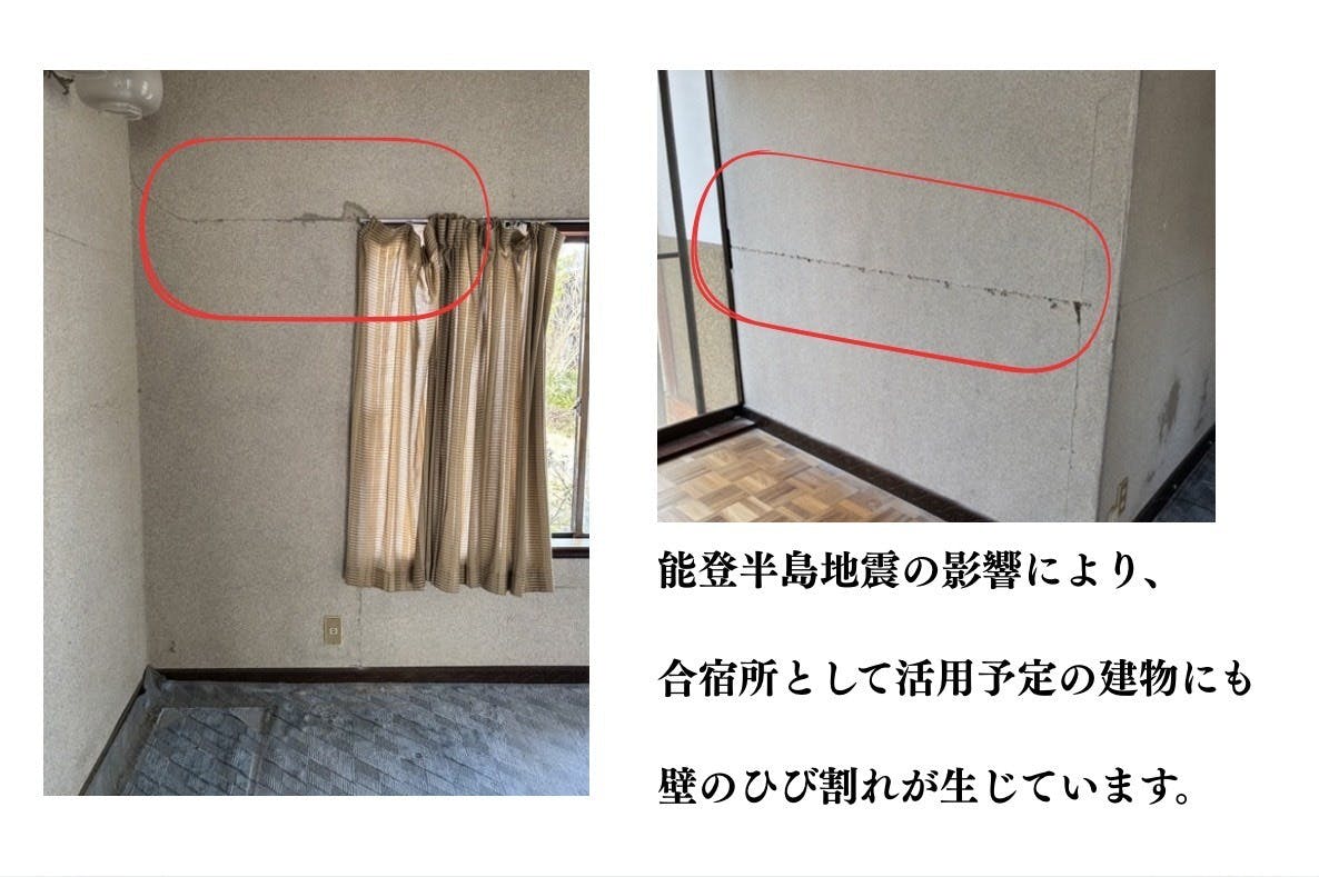 能登半島地震の影響により、合宿所として活用予定の建物にも壁のひび割れが生じています。今回の地震では石川県の被害が大きく報道されていますが、私たちの住む氷見市も大きな被害を受けました。今なお、倒壊した家屋がそのまま残っている地域もあります。このクラウドファンディングは、単なる合宿所づくりではありません。震災を乗り越え、地域に再び人が集まり、子どもたちの声が響く場所をつくる。その復興への想いも込めた挑戦です。