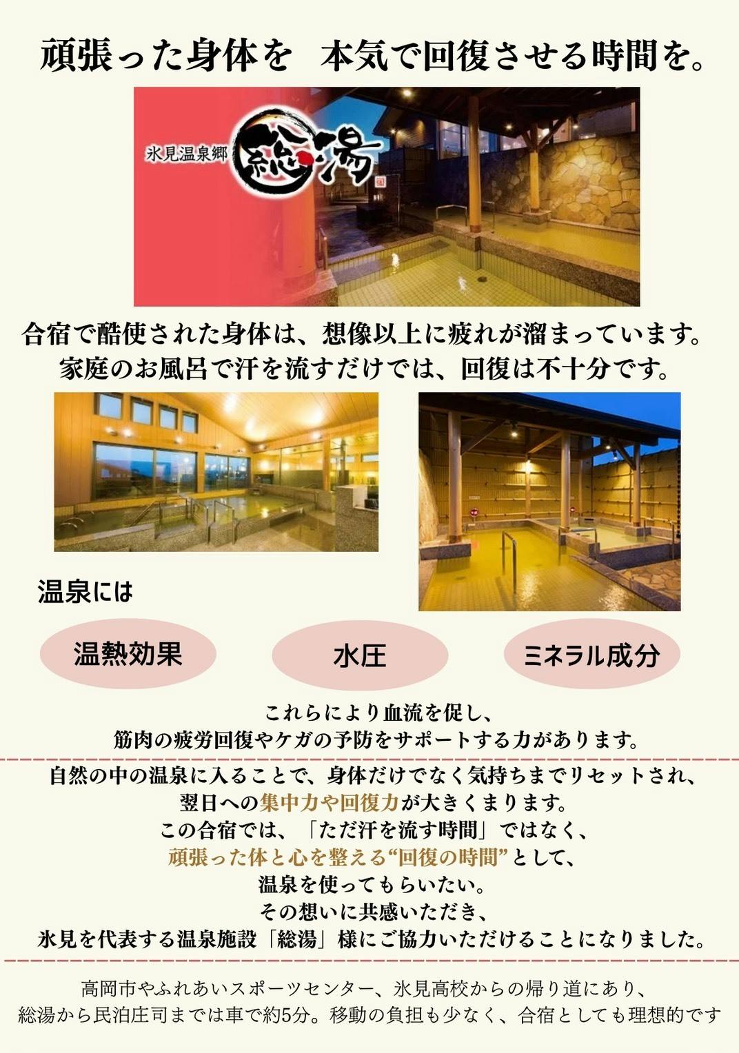 ②練習後は氷見温泉郷の総湯で汗を流し、地元仕出し屋の栄養満点ごはんで回復。