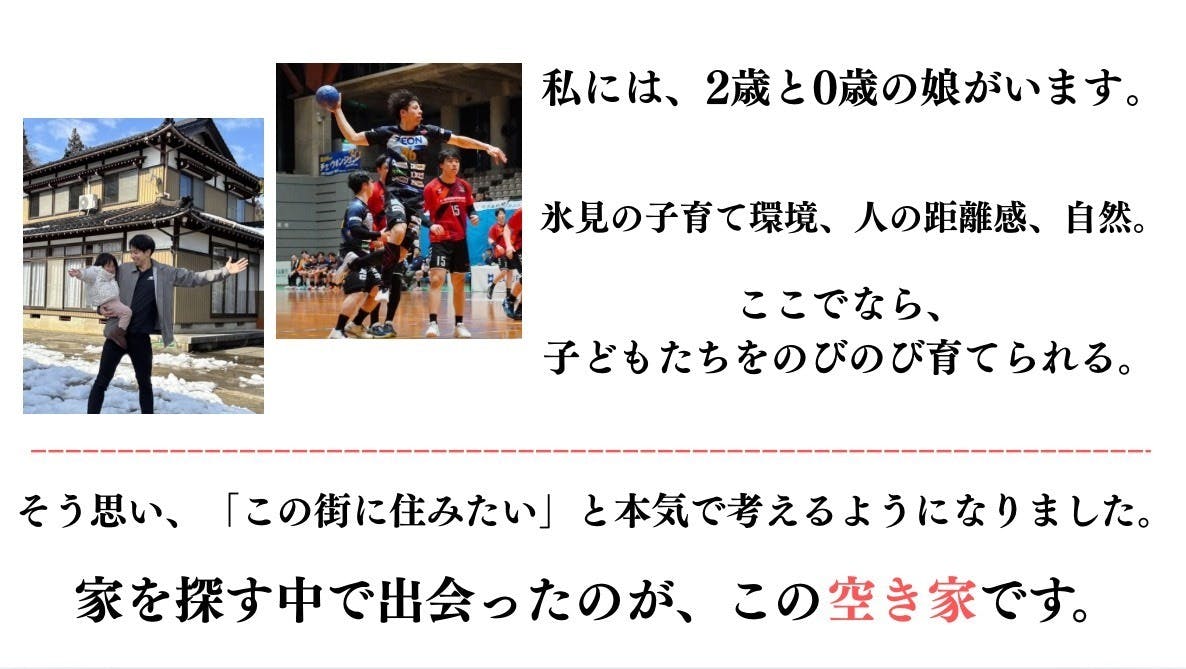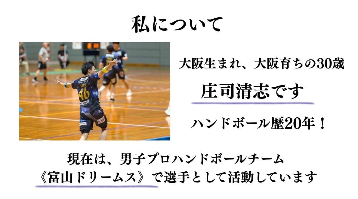 はじめまして、ハンドボール歴20年!現在は、男子プロハンドボールチーム「富山ドリームス」で選手として活動しています。庄司清志と申します。2026年5月に現役を引退し、新たな挑戦として富山県氷見市で、空き家を活用した「スポーツ×古民家×地域」を目指した民泊事業をはじめます!