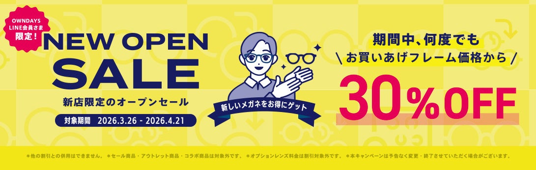2026年3月26日(木)から2026年4月21日( 火 )までの期間、 OWNDAYS 近鉄和歌山店をご利用いただくお客さまを対象に、フレームの表示価格から30%OFFとなる「NEW OPEN SALE」を実施いたします 。