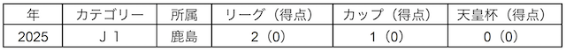 J1リーグ通算:2試合出場0得点、カップ戦通算:1試合出場0得点、天皇杯通算:0試合出場0得点