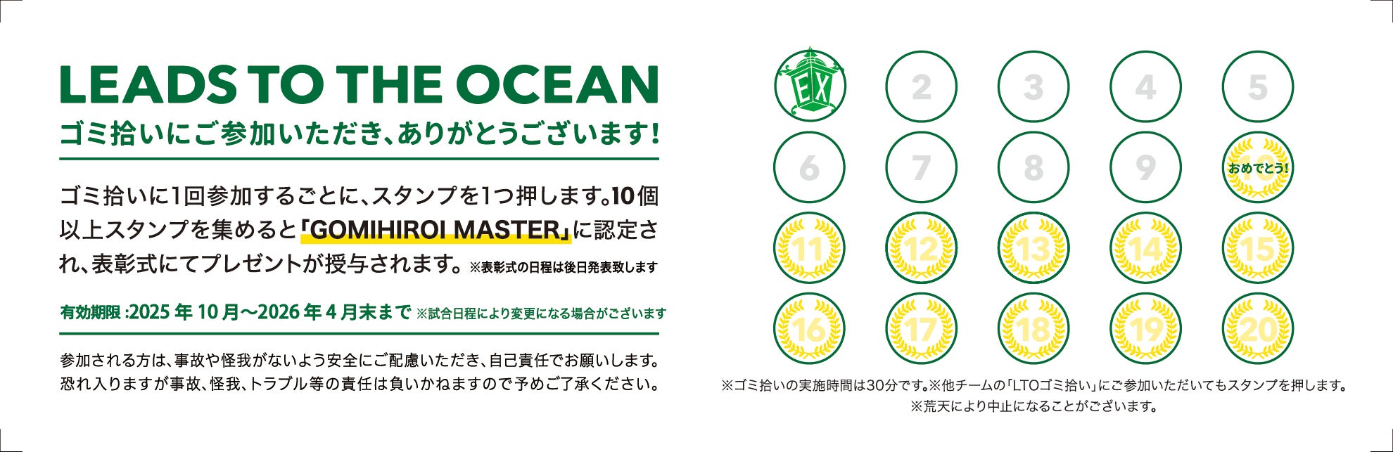 今シーズンも横浜エクセレンスでは各節、「LEADS TO THE OCEAN ~ 海につづくプロジェクト ~ Supported by 西松建設」(※以下:LTO活動)としてアリーナ付近のゴミ拾い活動を実施しており、「りそなグループ B.LEAGUE 2025-26 B2リーグ戦」最終戦に「規定の参加回数を満たした方」を「ゴミ拾いマスター」として表彰させていただきますので、そのお知らせとなります。