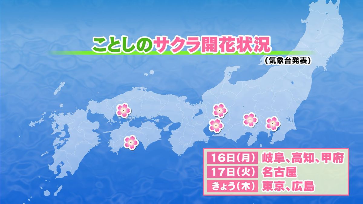 今年のサクラ開花一番乗りは、今週16日(月)に開花の岐阜と高知、山梨県の甲府。