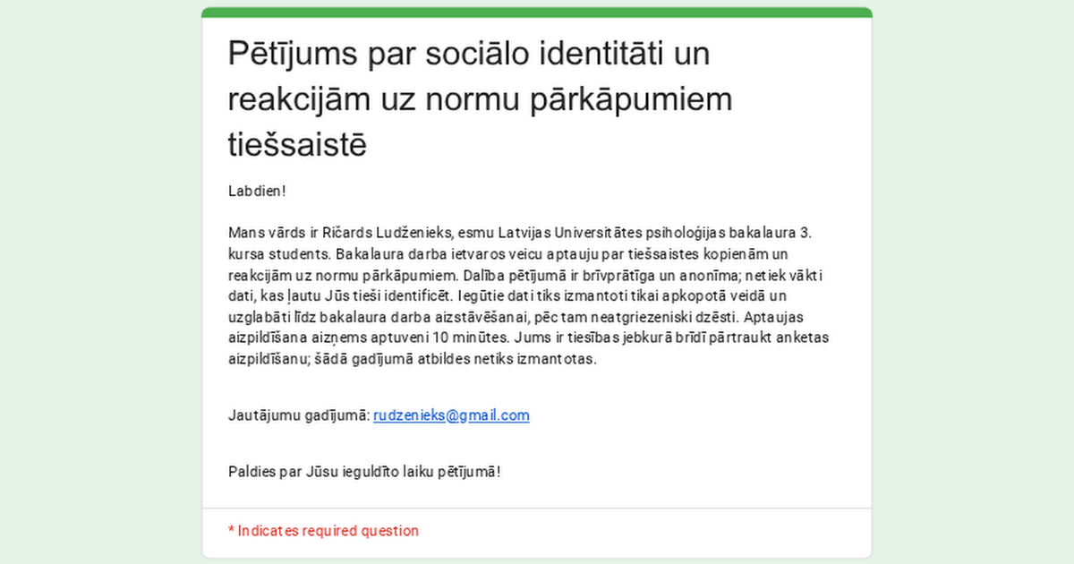 私はラトビア大学の心理学の学士課程の学生で、オンライン コミュニティとラトビアの規範違反に対する反応について匿名の調査を実施しました。 アンケートは 10 分以内で完了します。18 歳以上は任意です。 アンケートへのリンクです! https://docs.google.com/forms/d/e/1FAIpQLSeqBLIbgguGAq4RNeLvwhwjE0Hjm5pIVgUYJsacR_PU_-ArZg/viewform?usp=header ありがとう!研究に積極的にご参加いただきありがとうございます。 Latvia