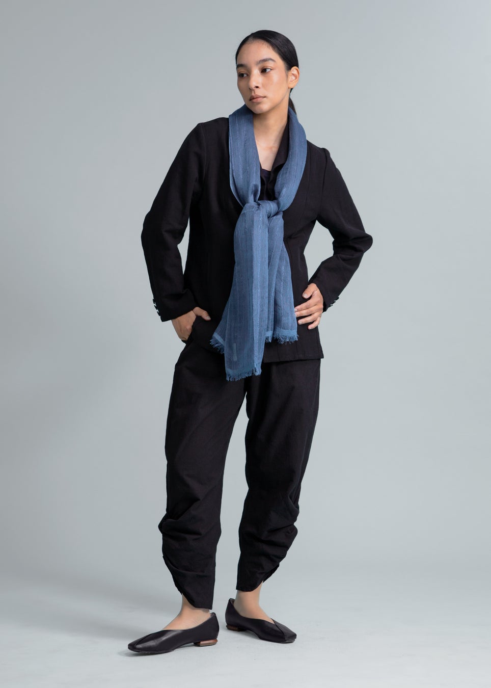 (JACKET) Rhythm Scarf Blouson Washed Khadi ¥53,900 (TOPS) Asymme Side Long SH F/S 150tw Khadi ¥39,600(BOTTOMS) Sculpted Twisted Hem PT 56dt Khadi ¥29,700