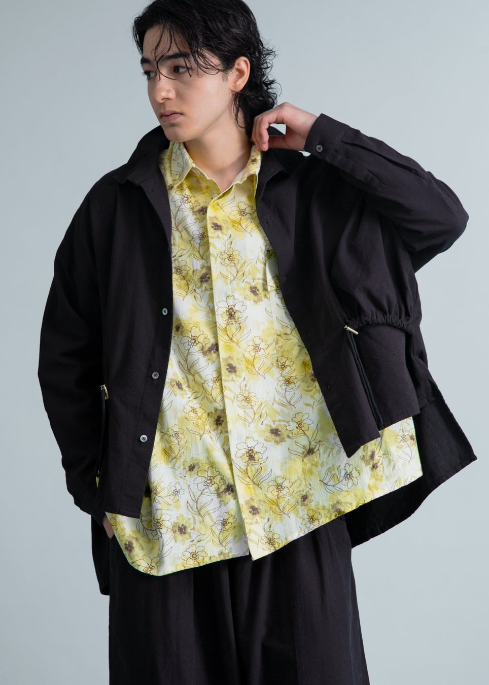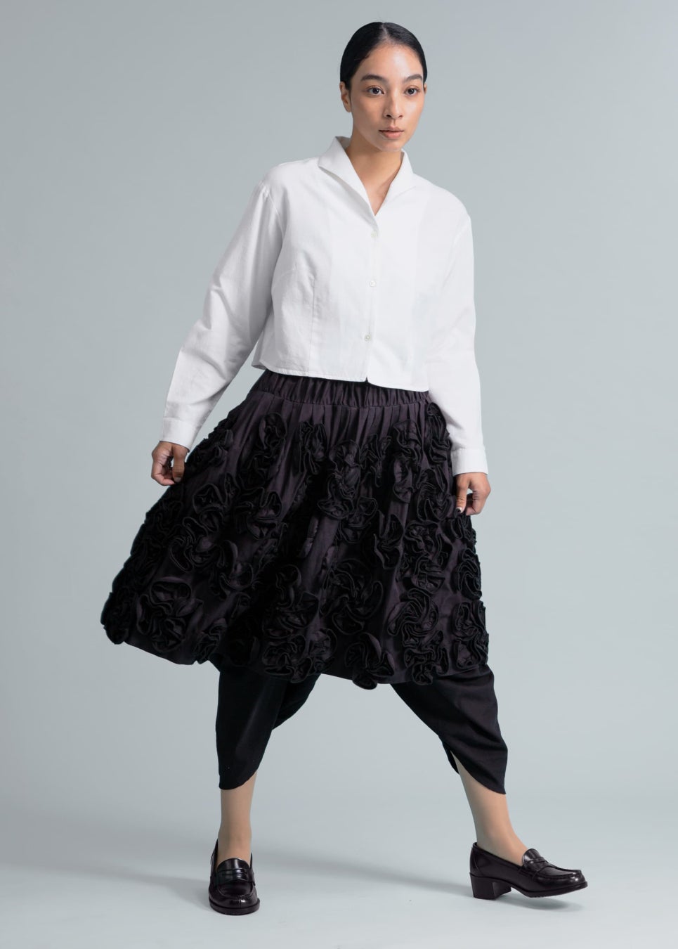 (TOPS) Kaname Shawl Collar SH 100dt khadi ¥26,400 (BOTTOMS) Bloom Volume Flower Skirt Cotton ¥59,400 (PANTS) Sculpted Drape Pants 150dt tw Khadi ¥44,000 (4月上旬発売予定)